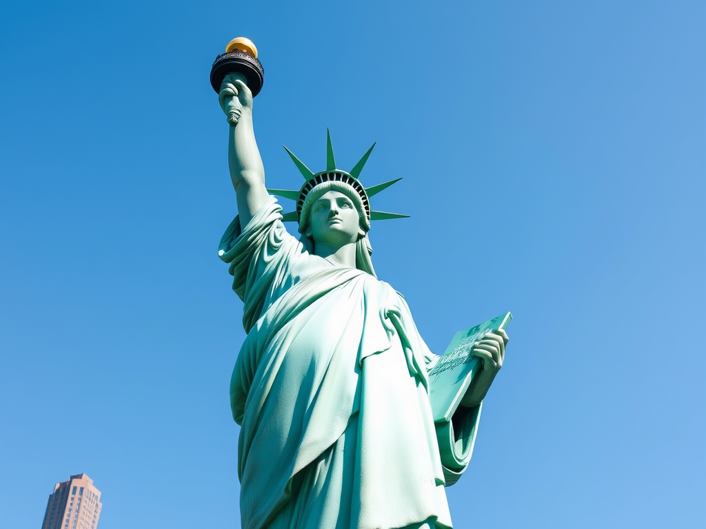 The majestic Statue of Liberty’s Torch, the beacon of freedom and liberty, is proudly held high by Lady Liberty.